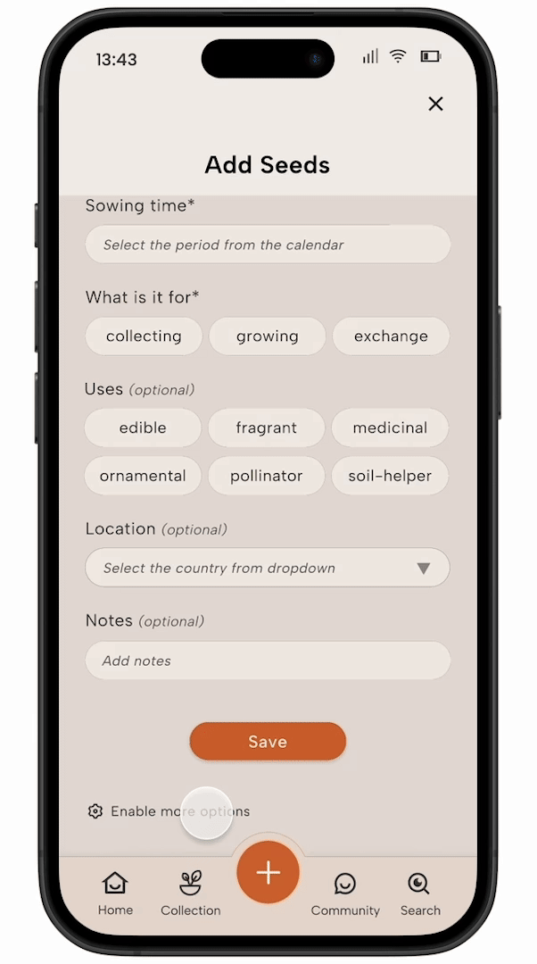 Seed collectors often face challenges in organizing their collections and managing planting schedules. Many juggle various motivations—personal, cultural, or practical—for gathering seeds, which leads to varied usage patterns. The app addresses a common gap in gardening tools: merging organization with location-specific planting advice without going too much into plant care.