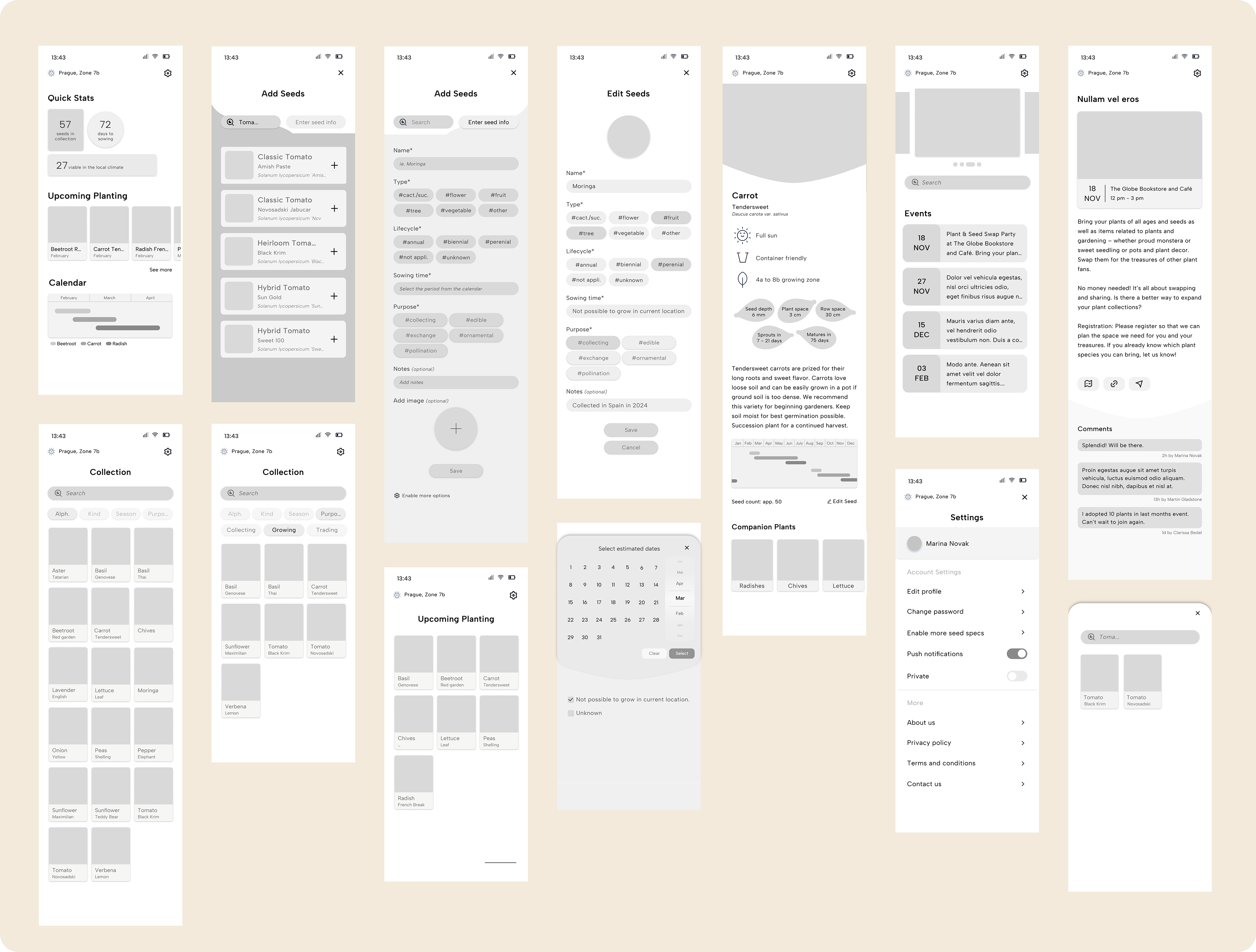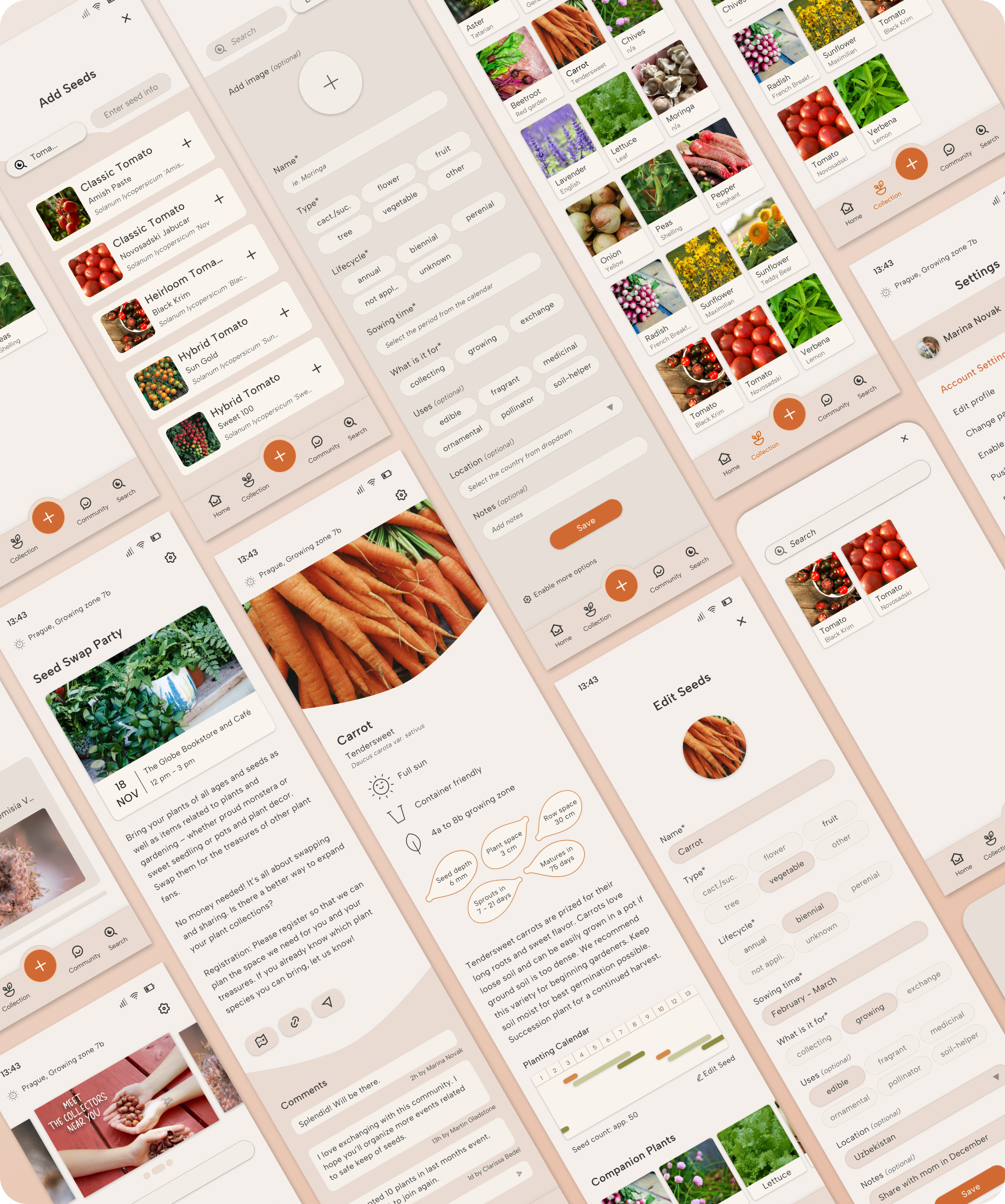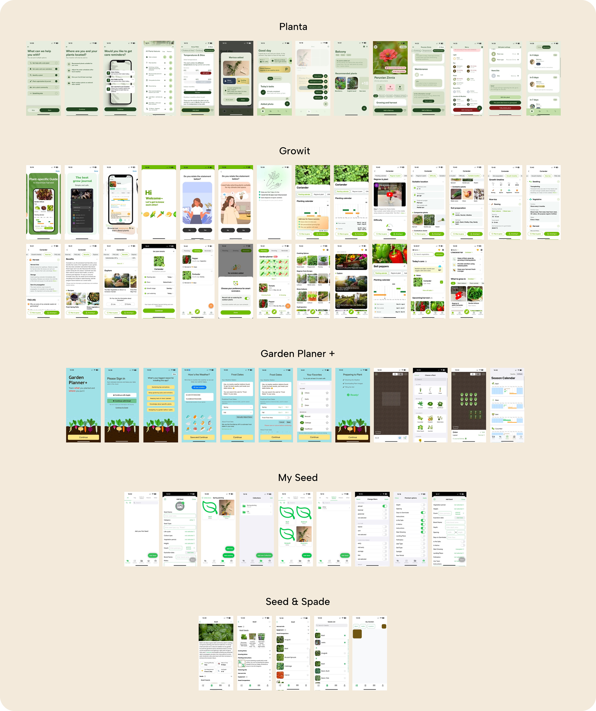 The final screens present the completed design of the app, incorporating user feedback and a carefully considered visual style. With its earthy tones and intuitive layout, the design focuses on making seed organization and planting timelines clear and accessible. These screens represent the culmination of the app's development process, offering a simple yet functional experience for users.