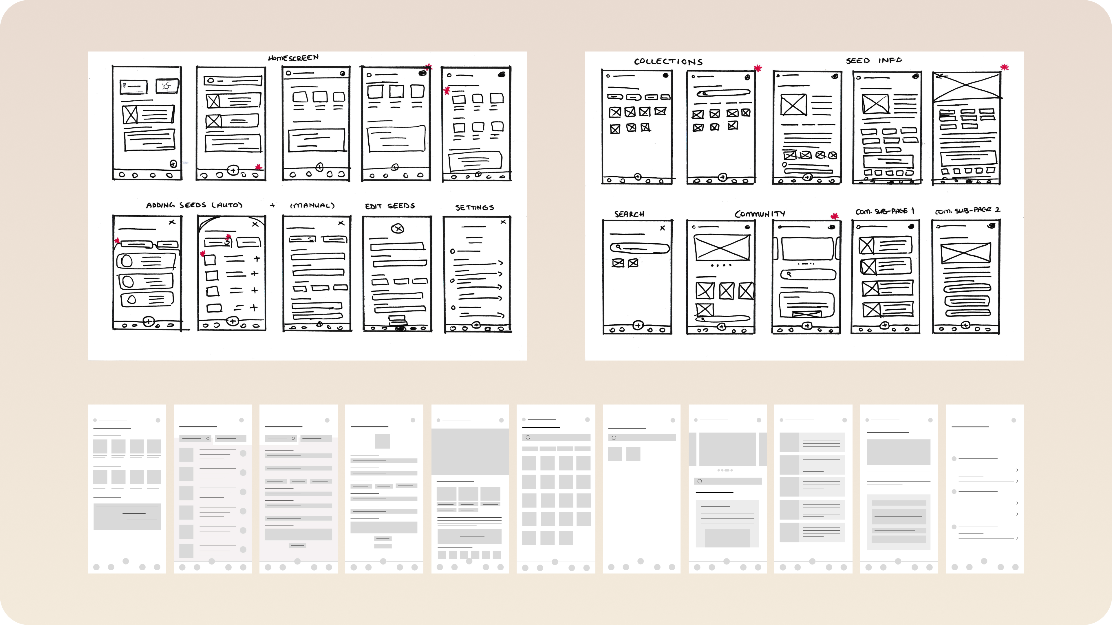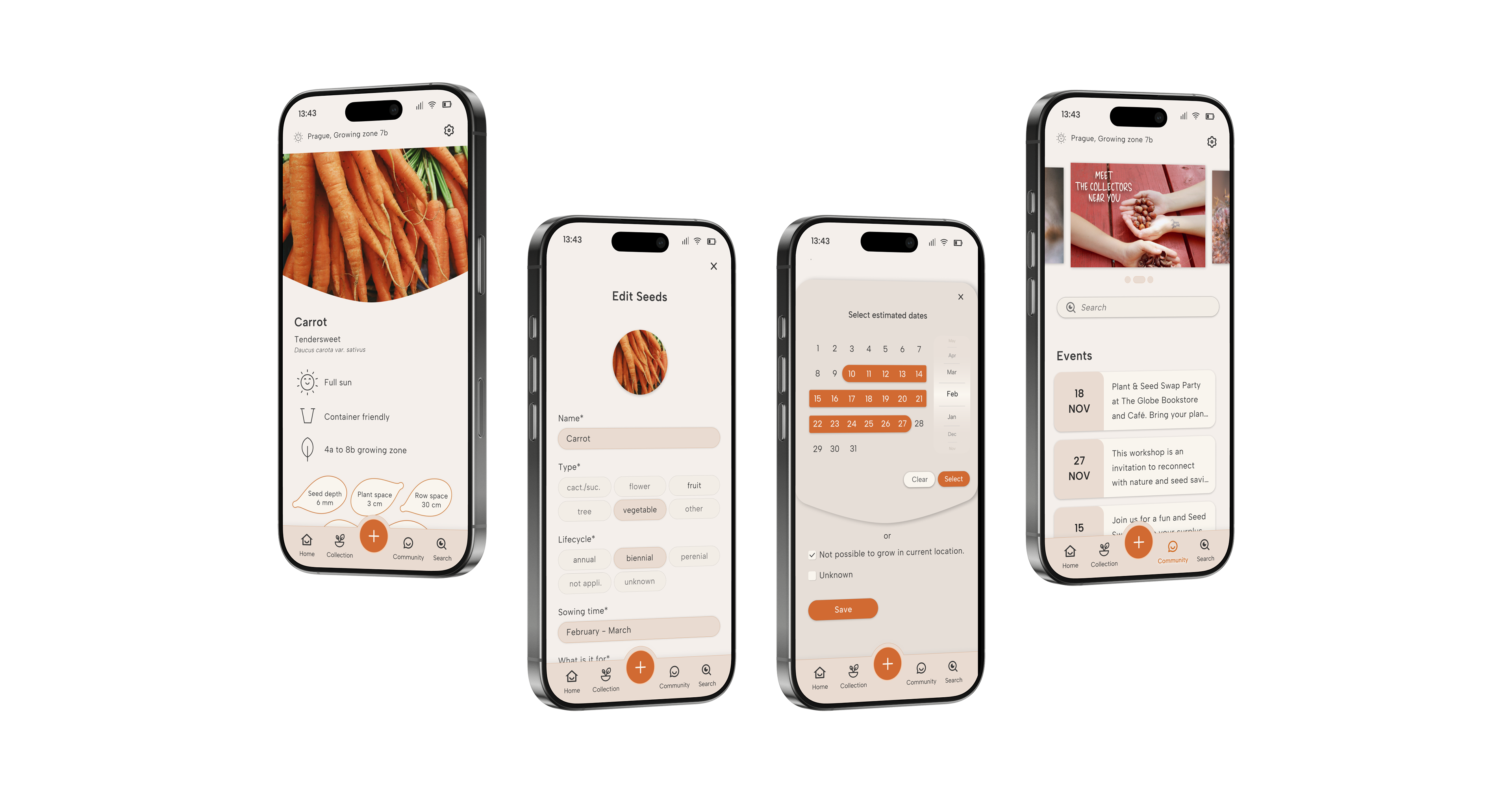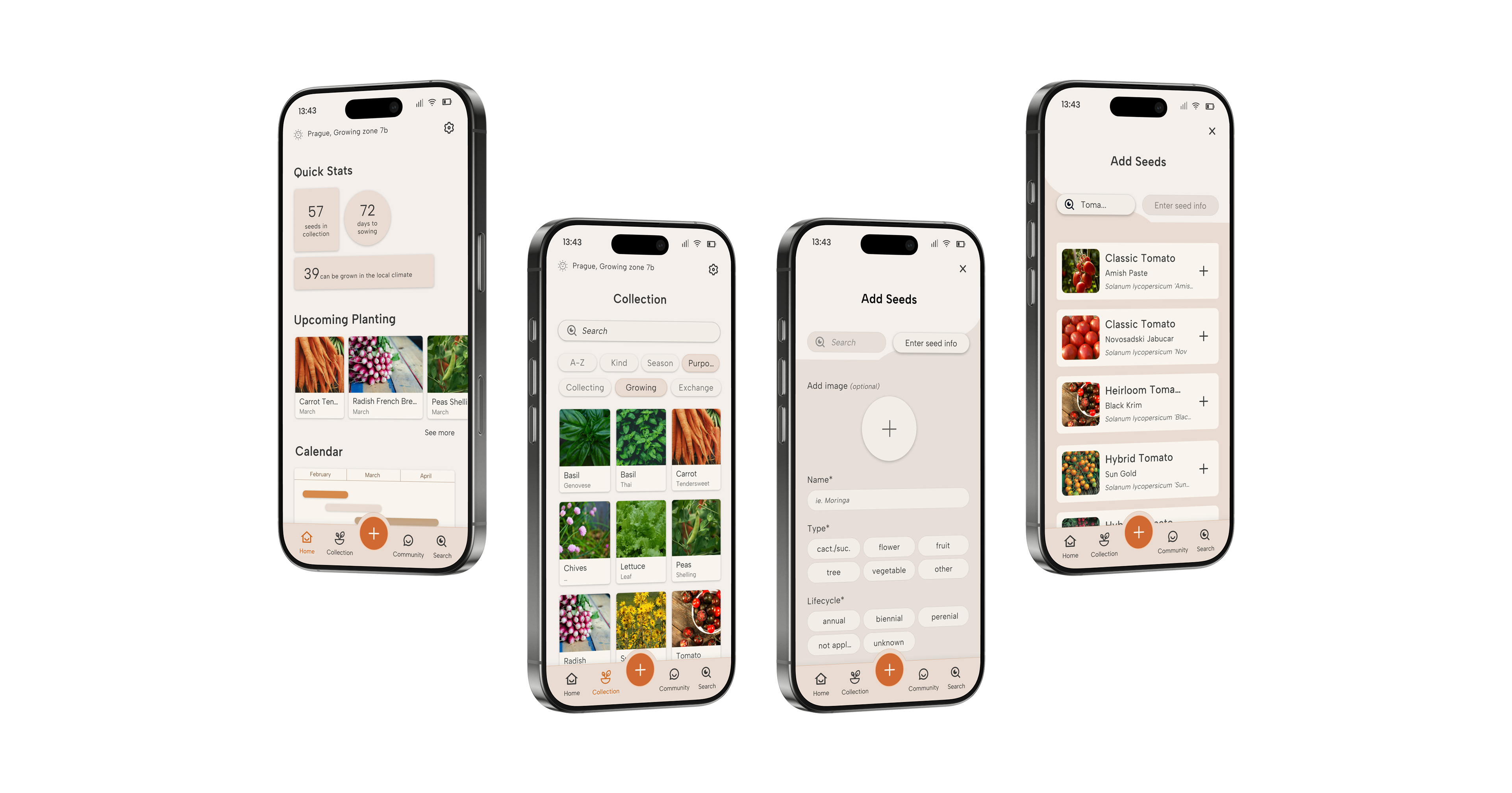 The final screens present the completed design of the app, incorporating user feedback and a carefully considered visual style. With its earthy tones and intuitive layout, the design focuses on making seed organization and planting timelines clear and accessible. These screens represent the culmination of the app's development process, offering a simple yet functional experience for users.