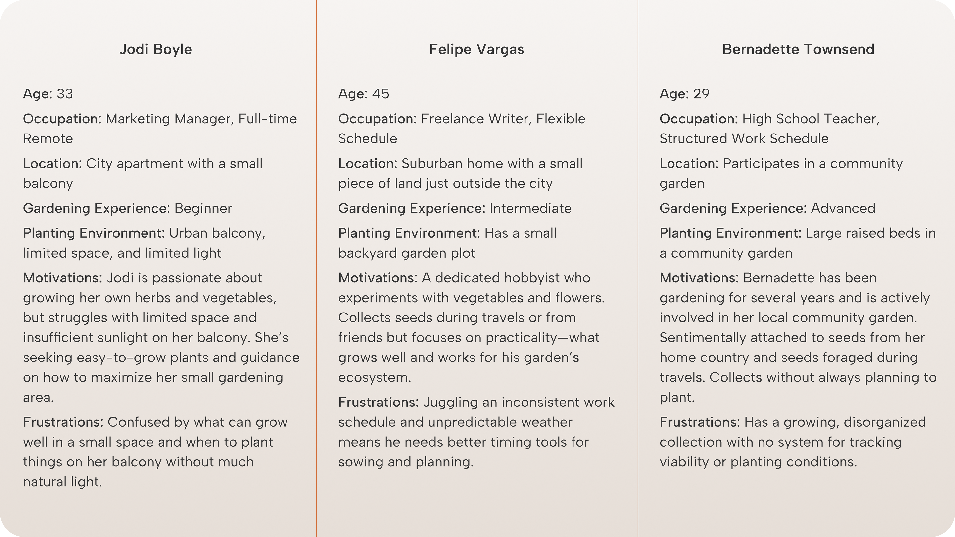 A survey was distributed to potential users to gain insights into their habits, motivations, and challenges regarding seed collecting and gardening. Participants ranged from beginner gardeners with small urban spaces to experienced individuals managing large seed collections. The survey explored: