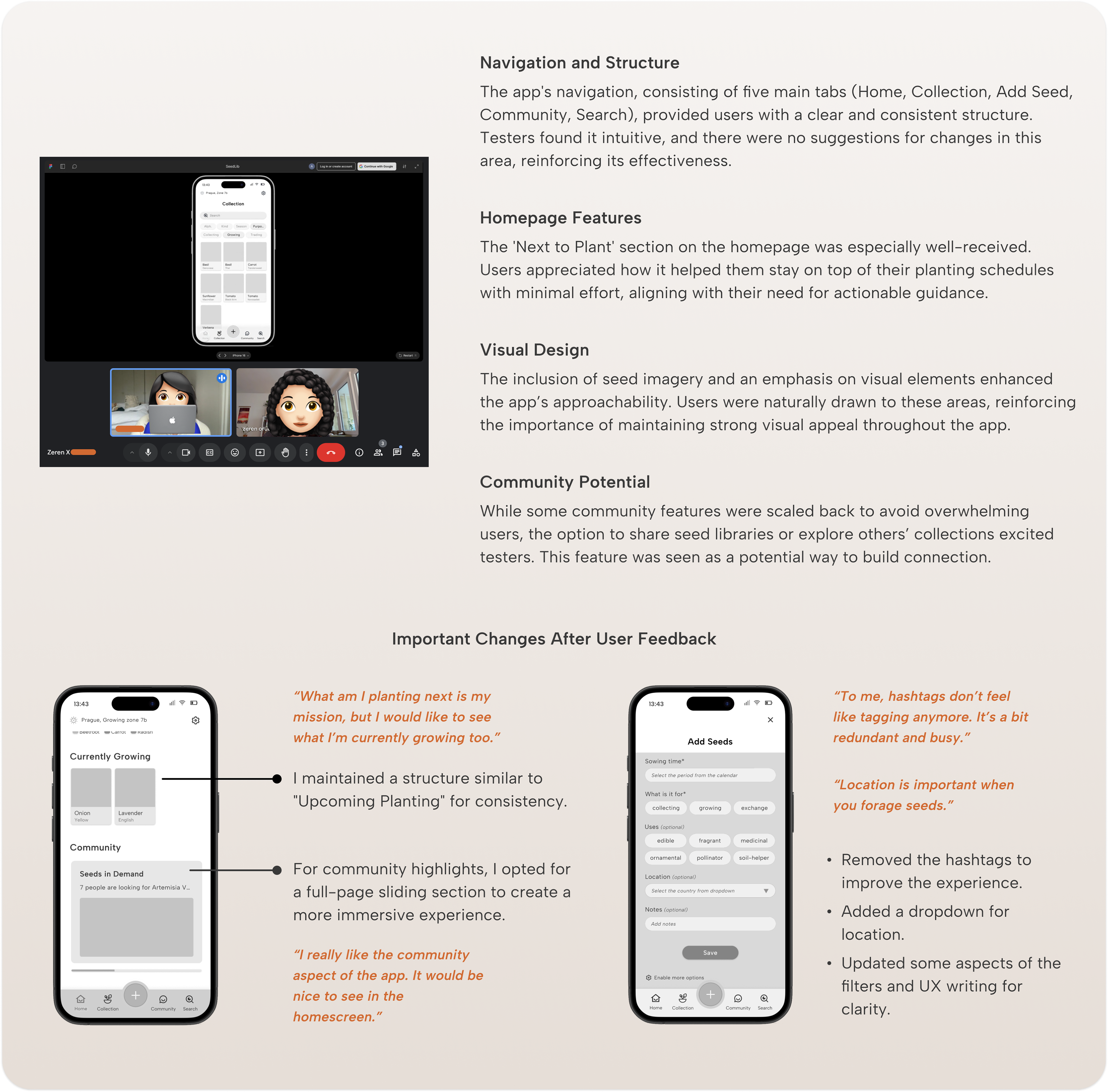 This project offered meaningful insights into the design process, particularly the importance of staying adaptable and open to unexpected directions. While I initially focused on creating a tool for personal seed organization, research and feedback highlighted the significant role community features could play.