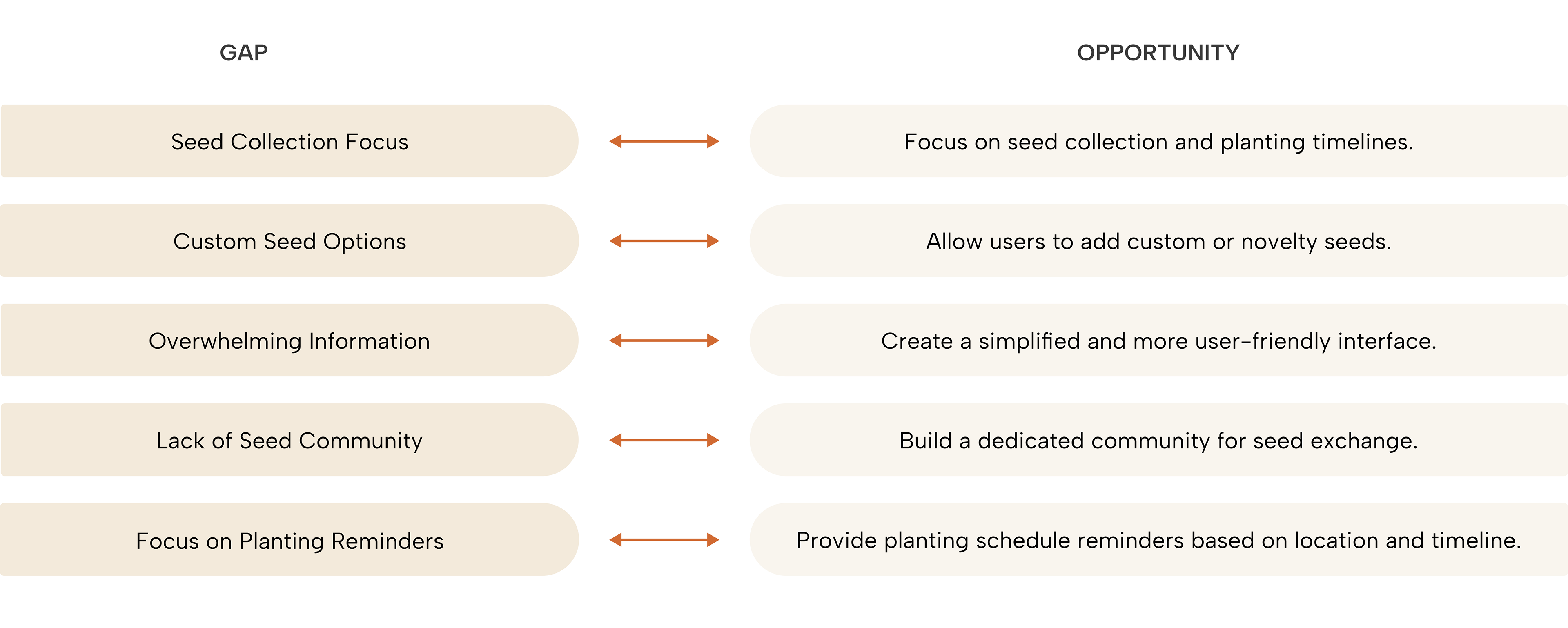 The research revealed a surprising insight: there are no apps solely dedicated to seed catalogs. Most existing solutions focus on general plant care, gardening tasks, or food production, where seeds are included but not prioritized. This lack of dedicated seed-focused apps highlights a significant gap in the market for users who want a streamlined tool tailored to organizing and planning around their seed collections.